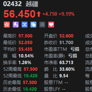 3月13日消息,越疆早盘再度冲高,截至发稿,报56.45港元,成交额2.5亿港元。