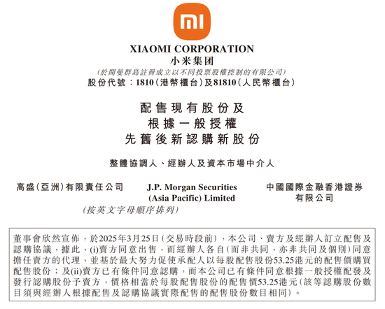 根据公告,小米集团、卖方及经办人高盛(亚洲)有限责任公司、J.P. Morgan Securities(Asia Pacific)Limited及中国国际金融香港证券有限公司已于2025年3月25日订立配售及认购协议。根据该协议,卖方同意出售,而经办人则同意作为卖方的代理,以每股53.25港元的配售价向不少于六名独立的专业、机构及个人投资者配售8亿股现有股份。同时,卖方已有条件同意认购,小米集团亦有条件同意根据一般授权向卖方配发及发行相同数量的新股份,认购价与配售价相同。