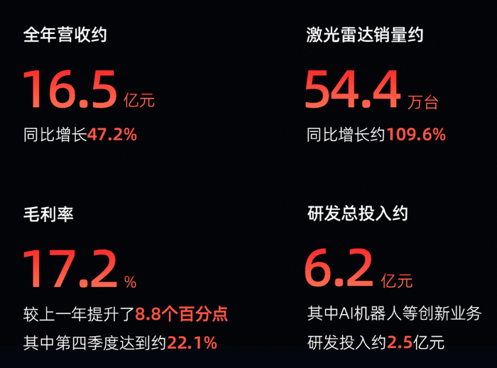 财报显示,速腾聚创2024年全年总收入约16.5亿元,同比增长47.2%,并已实现连续三年高速增长;整体毛利率约17.2%,其中第四季度约22.1%。