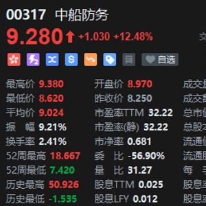 4月9日消息,港股中船防务早盘大涨,截至发稿涨超12%,报9.28港元,成交额1.29亿港元。
