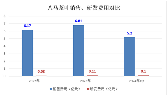 招股书显示,2022年~2024年前三季度,八马茶业的销售费用为6.17亿元、6.81亿元、5.20亿元,占总营收的比重为33.93%、32.08%、31.55%。同期,八马茶业的研发费用为822万元、1162.1万元、1006.4万元,占总营收的比重分别为0.45%、0.55%、0.61%。