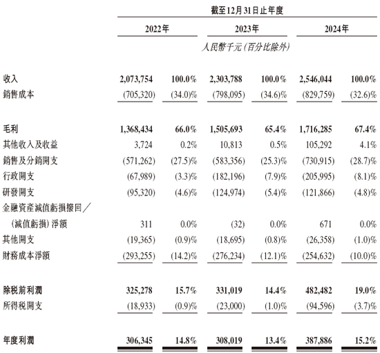 招股书显示,在过去的2022年、2023年和2024年三个财政年度,亿腾医药的营业收入分别为20.73亿、23.04亿和25.46亿元人民币,相应的净利润分别为3.06亿、3.08亿和3.88亿元人民币。