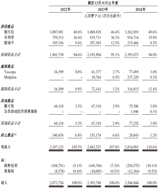 于营业纪录期间,亿腾医药大部分收入来自销售原研产品。