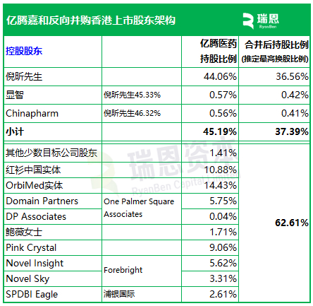 合并完成后,按推定最高换股比例,倪昕先生将成为亿腾嘉和的控股股东,持股约37.39%。