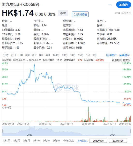 洪九果品,于2022年9月5日在港交所挂牌上市,当时以每股40港元的价格发行1,429.49万股,共募资5.72亿港元。截至停牌之日(2024年3月20日),洪九果品每股报1.74港元,股价较IPO发行价大跌95.65%,目前总市值为27.95亿港元。