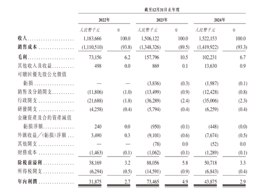 但从业绩表现来看,2022年、2023年和2024年,顺友物流的营业收入分别为11.84亿元、15.06亿元和15.22亿元,毛利分别为7316万元、1.58亿元及1.02亿元,对应毛利率为6.2%、10.5%和6.7%;利润分别为3188万元、7347万元和4388万元。