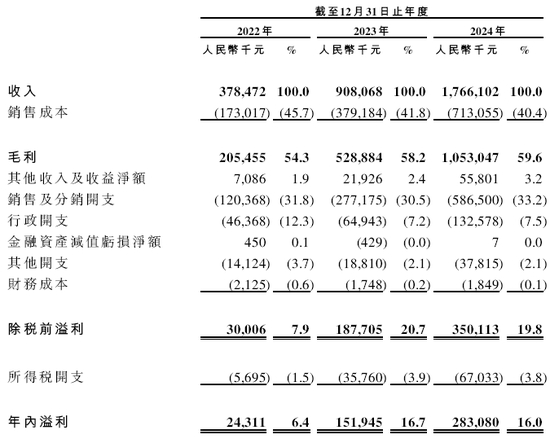 招股书显示,在过去的2022年、2023年、2024年,伯希和户外的营业收入分别人民币3.78亿、9.08亿和17.66亿元,相应的净利润分别为人民币0.28亿、1.56亿和3.04亿元。