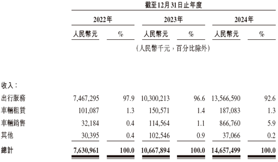 曹操出行的收入主要来自以网约车形式提供的出行服务,其他还包括来自车辆租赁、车辆销售等产生的收入。