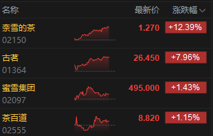 5月2日消息,港股新茶饮股集体上行,截至发稿,奈雪的茶大涨超12%,古茗涨近8%股价创历史新高,蜜雪集团、茶百道涨超1%。