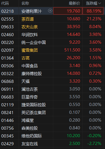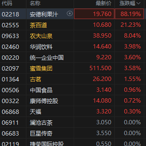 5月6日消息,港股非酒精饮料股集体走强,其中,安德利果汁涨近90%,茶百道涨超21%,农夫山泉涨近8%,华润饮料、蜜雪集团、统一企业中国涨超3%。