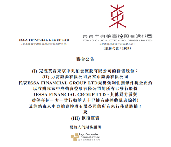 收购方拟在要约结束后,维持东京中央拍卖在联交所的上市地位,也无意行使任何强制收购任何发行在外股份的权力。