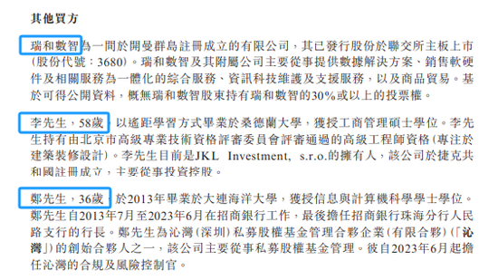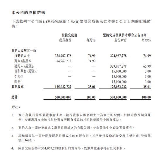 收购完成后,黄仕坤旗下的ESSA FINANCIAL GROUP LTD将持有65.99%的股权,瑞和数智(03680.HK)、李杰峰、郑浩然则各持有3%的股权。