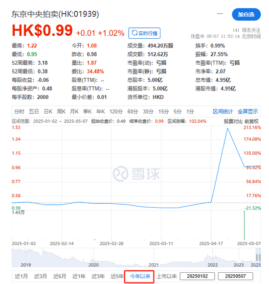 截至午间收市,东京中央拍卖每股报0.99港元,今年以来累计涨102.04%,总市值约4.95亿港元。