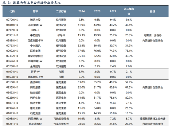 考虑到当前风险溢价水平回落至压力位附近、且二季度基本面预期将面临更多不确定性,我们仍建议关注外需敞口,适当降低风险偏好。表3更新了截止2024年年报港股头部上市公司海外收入占比情况。