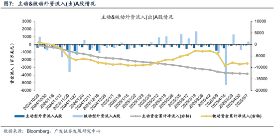 A股主动外资流出小幅增加,被动外资转为流入;H股主动外资变化不明显,被动外资流入小幅收窄。截至本周三(5月1日—5月7日),A股主动外资流出1.3亿美元(相比上周流出1.0亿美元小幅增加),被动外资流入3.7亿美元(相比上周流出6.9亿美元发生逆转);H股主动外资流出0.03亿美元(相比上周变化不明显),被动外资流入0.15亿美元(相比上周流入0.21美元放缓)。