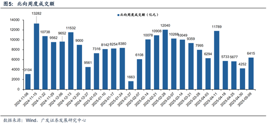 北向资金本周日均成交额与上周基本持平。本周(5月6日—5月9日)北向资金总成交金额为0.64万亿元,日均成交额为1603亿元,较上周日均成交金额减少187亿元。