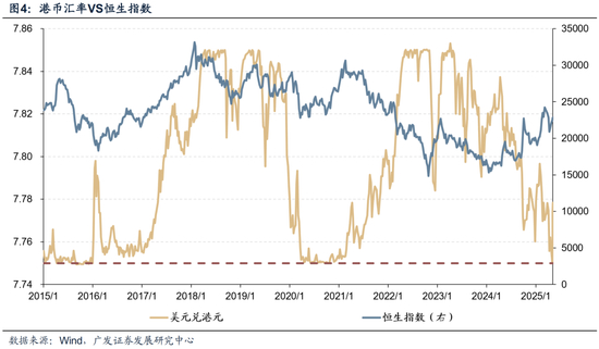 历史上看,港币升值触发 “强方兑换保证”阶段,港股市场整体表现偏强。但同时要看到,港币汇率与港股市场流动性实质上是互为因果的。一方面,美元走弱,港币回流,港股市场流动性改善;另一方面,年初以来港股市场情绪高涨,挣钱效应强,也会吸引资金流入,从而提升港元需求、引发港元升值。因此任一环节逻辑扭转,都可能触发反向传导链条,比如前一轮港币脱离强势区间的时点大约在2021年1月末,时间上正对应中国市场消费核心资产泡沫破裂。下一阶段,除了美元指数企稳风险以外,更需关注的或在于内外需冲击下的基本面下行压力。