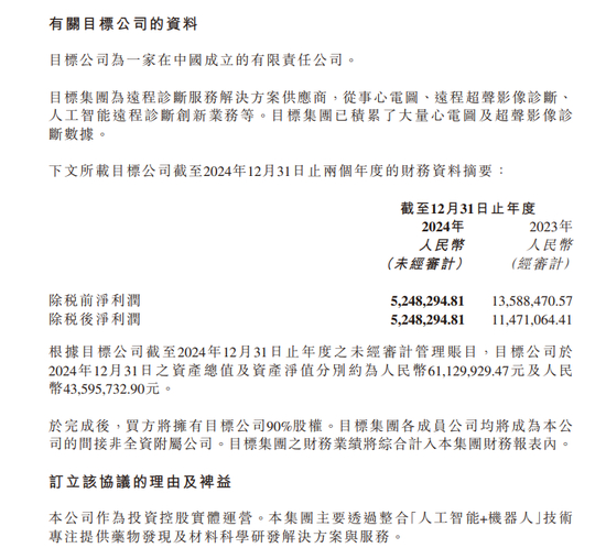 预计收购后,晶泰科技可系统性整合目标集团营运积累的心电诊断数据集,配以集团AI辅助诊断系统,建立工智能赋能的远程心电诊断平台,大幅提升医生看片效率,有效缓解基层医疗心电诊断资源分布不均的痛点,以及加速推进心血管创新药物管线及功能性健康产品的研发进程。