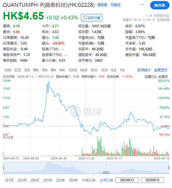 截至午间(5月12日)收市,晶泰科技(02228.HK)收报每股4.65港元,目前市值约186.92亿港元。