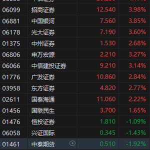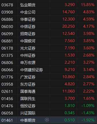 5月12日消息,港股中资券商股午后冲高,弘业期货一度涨超22%,中金公司、华泰证券、中信证券等纷纷跟涨。