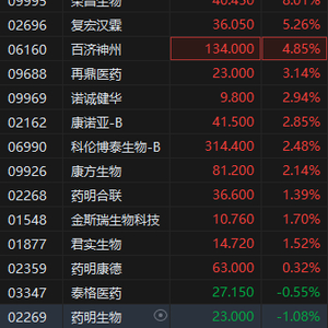 5月13日消息,港股昨日集体下跌的生物医药板块今日集体反弹,截至发稿,荣昌生物涨超8%,复宏汉霖涨超5%,百济神州涨超4%,再鼎医药涨超3%,诺诚健华、康诺亚、科伦博泰生物、康方生物涨超2%。