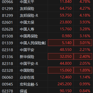 5月14日消息,港股保险股普遍拉升,截至发稿,中国太平、友邦保险涨超4%,中国太保、中国人寿、中国再保险、中国人民保险集团涨超3%,中国平安等涨超2%。