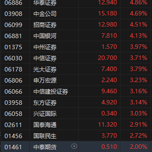 5月14日消息,港股中资券商股全线走强,截至发稿,弘业期货涨超16%,涨幅一度达25%;恒投证券涨超11%,广发证券涨超6%,华泰证券、中金公司、招商证券、中国银河涨超4%。