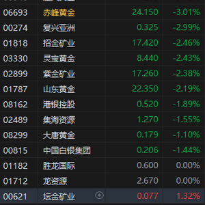 5月15日消息,国际金价下跌,港股黄金股集体走低,截至发稿,潼关黄金、赤峰黄金跌超3%,复兴亚洲跌近3%,招金矿业、灵宝黄金、紫金矿业、山东黄金跌超2%。