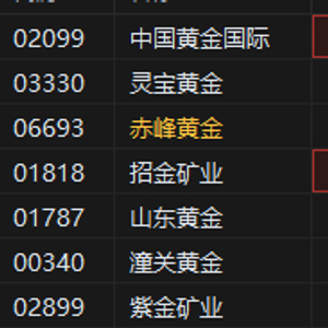 5月16日消息,港股早盘黄金股齐涨,中国黄金国际、灵宝黄金涨超3%,赤峰黄金、招金矿业涨超2%。