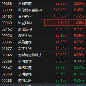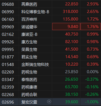 5月16日消息,港股生物医药板块早盘震荡走高,截至发稿,再鼎医药、科伦博泰生物涨超2%,百济神州诺诚健华涨超1%。