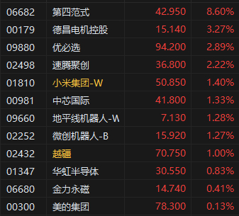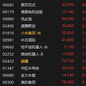 5月16日消息,港股机器人概念股多股上涨,第四范式涨超8%,德昌电机控股涨超3%,优必选、速腾聚创涨超2%。
