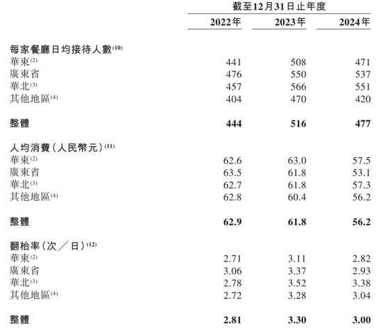 据招股书数据,2022年至2024年,绿茶集团每家餐厅日均接待人数分别为444人、516人、477人;对应的客单价分别为62.9元、61.8元和56.2元;公司翻台率分别为2.81次/日、3.30次/日和3.00次/日。同时,绿茶餐厅的同店销售额和同店销售增长率在2024年均有下滑。其中,公司同店销售额从2023年的22.69亿元下滑至2024年的20.35亿元;公司2024年同店销售增长率为-10.3%。