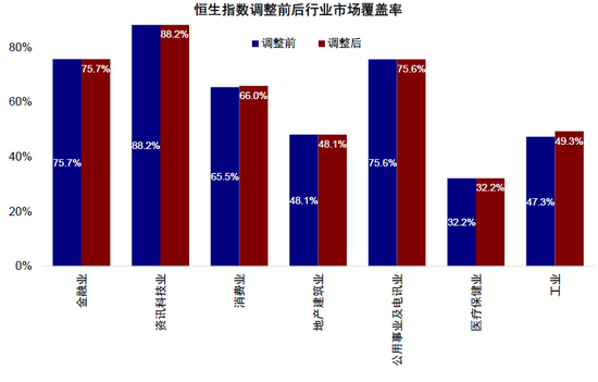 ► 行业覆盖度与代表性:消费业与工业市场覆盖度有所提升。参照恒指公司的对行业分类(即7个行业分类),此次恒指调整后,对于消费业的覆盖度从65.5%提升至66.0%,工业覆盖度也从47.3%抬升至49.3%。