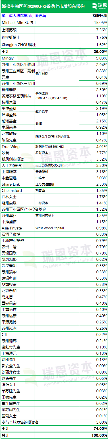 招股书显示,派格生物医药在上市后的股东架构中,单一最大股东集团合计持股约26.00%;其他投资者包括Mingly基金、元生创投、泰格医药(300347.SZ,03347.HK)、盈科资本、前海、联想控股(03396.HK)、君联资本等。