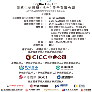 派格生物医药是次IPO,中金公司为其独家保荐人、整体协调人、联席全球协调人,民银证券、农银国际为其为其整体协调人、联席全球协调人,中银国际、建银国际为其联席全球协调人,其他包销商包括利弗莫尔证券、中泰国际、浦银国际、艾德证券、国金证券、光大证券国际、广发证券(香港)、中国银河国际、光银国际。