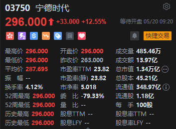5月20日消息,今日在港股上市的宁德时代高开12.55%,报296港元/股,成交额已达13.97亿港元,总市值达1.34万亿港元。每手100股,不计手续费,每手赚3300港元。