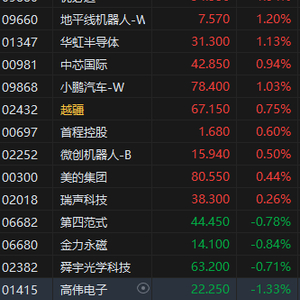 5月20日消息,港股机器人概念股普遍上涨,其中,小米集团涨超3%,国华、德昌电机控股涨超2%,速腾聚创、盛业、优必选、地平线机器人等涨超1%。