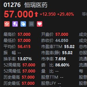 5月23日消息, 恒瑞医药港股上市首日高开,涨幅达29.4%,报57港元,成交额16.55亿港元,总市值3764.01亿港元;每手200股,不计手续费,每手赚2590港元。