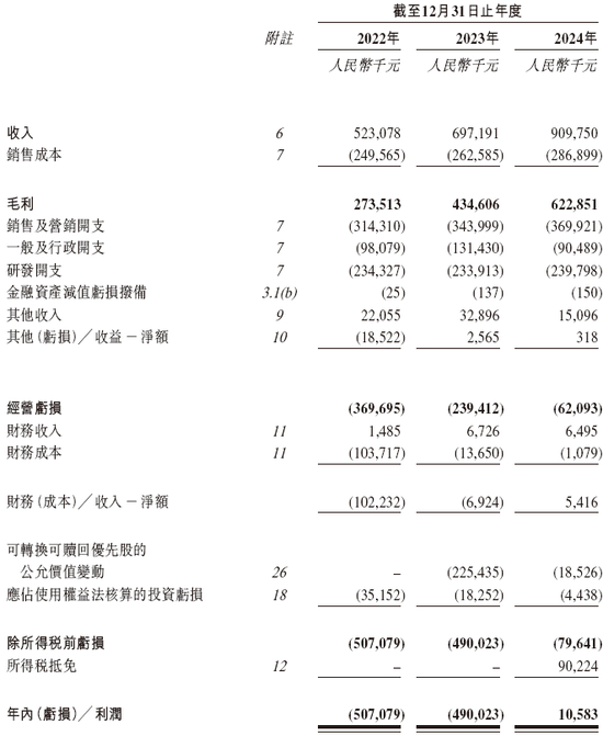 招股书显示,在过去的2022年、2023年和2024年,聚水潭的营业收入分别为人民币5.23亿、6.97亿和9.10亿元,相应的净利润分别为人民币-5.07亿、-4.90亿和1,058.3万元,相应的经调整净利润分别为人民币-3.79亿、-2.06亿和4,898.8万元。