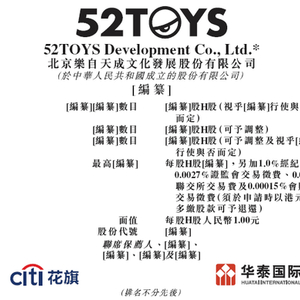 2025年5月22日,北京乐自天成文化发展股份有限公司52TOYS Development Co., Ltd.*(简称“52TOYS”或“乐自天成”)在港交所递交招股书,拟在香港主板挂牌上市。