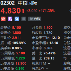 5月26日消息,港股中核国际午后持续拉升,涨幅超170%。截止发稿,股价报4.83港元,总市值23.63亿港元。