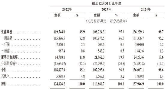 招股书显示,在过去的2022年、2023年和2024年,牧原股份的营业收入分别为人民币1,248.26亿、1,108.61亿和1,379.47亿元,相应的净利润分别为人民币149.33亿、-41.68亿和189.25亿元。