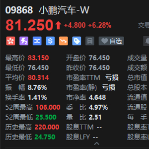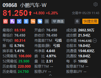 5月29日消息,小鹏汽车今日强势,盘中一度拉升涨近9%,报83.15港元,截至目前涨6.28%,报价81.25港元,成交逾21亿港元。
