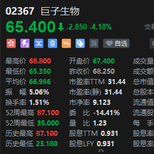 6月3日消息,巨子生物再跌超4%,当前股价较历史高点已回撤逾20%。截至发稿,跌4.18%,报65.4港元,成交额10.8亿港元。