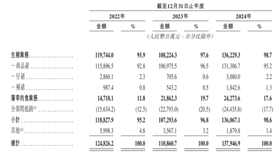 牧原股份的业务主要包括生猪和屠宰肉食两大板块。其中,生猪业务包括饲料生产、生猪育种、生猪养殖以及商品猪、仔猪及种猪销售。而商品猪又是公司支柱性收入来源,报告期各期贡献95%左右的收入。
