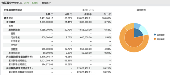 Wind显示,上市以来,牧原股份累计募资748.11亿元。其中,直接融资160.5亿元(包括股权再融资、发债融资、IPO融资等),间接融资(按增量负债计算)587.61亿元。