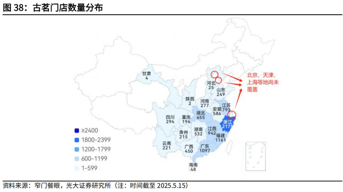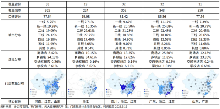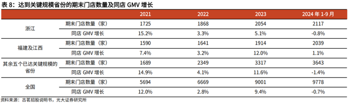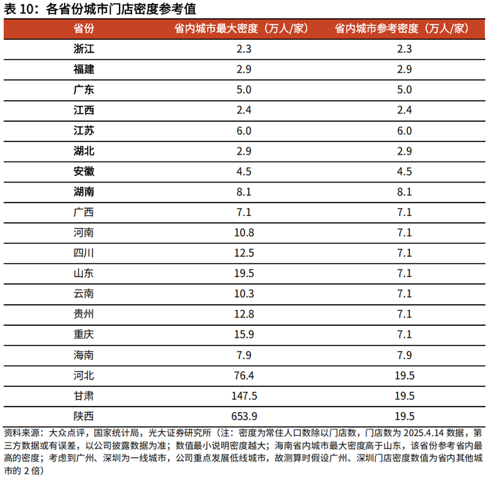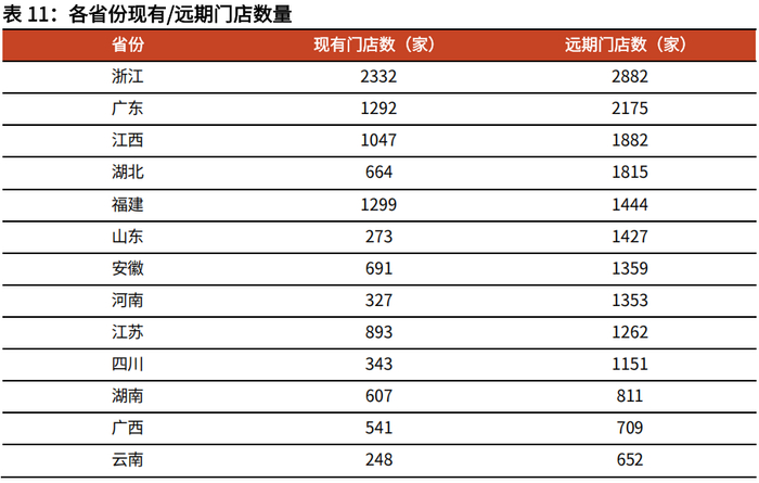 我们根据各省份门店数量的不同,将已进入的省份分为已达到关键规模的省份(浙江、福建、广东、江西、江苏、湖北、安徽、湖南),有增长潜力的省份(广西、河南、四川、山东、云南、贵州、重庆),待发展省份(海南、河北、甘肃、陕西)。