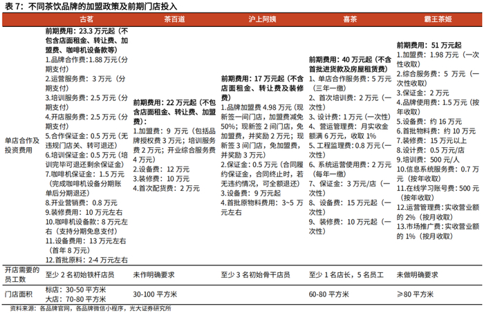 古茗门店利润率较高,对加盟商具备吸引力。根据古茗招股说明书,古茗的单店经营利润率在2023年达20.2%,而同期大众现制茶饮店的单店经营利润率大多低于15%。从渠道调研来看,古茗单店年收入约为182万元,毛利率约为55%,与现制茶饮主流品牌基本处于同一水平,扣除各类其他成本之后,单店最终利润率为18.2%,属于业内较高水平。此外,由于古茗单店投入规模相对合理,且大部分费用允许分期支付,结合单店利润率的优势对于加盟商颇具吸引力。