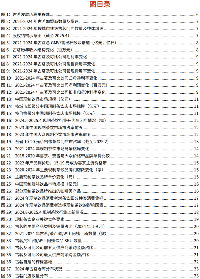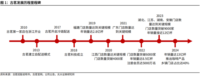 深耕现制茶饮十余年,从浙江走向全国。古茗成立于2010年,创始人王云安在浙江开办首家门店,同年开放加盟。2013年,古茗开始部署自配送模式,搭建自有供应链。2017年,古茗开启冷链配送模式,加强供应链建设。2018年,古茗科技成立,成为古茗的主要经营实体。2019年-2021年,古茗门店数量在浙江达到约1000家,并陆续于福建、江西和广东达到关键规模500家。2022年,古茗门店总数突破6000家大关。2023年,古茗门店总数再上新台阶,超过9000家,于湖北、江苏、湖南和安徽达到关键规模,并继续在中国南方其他省份快速扩张。2024年古茗上线咖啡产品,进军现制咖啡赛道,同时下沉市场渗透度进一步提升,乡镇地区门店数量占比提升至40%。