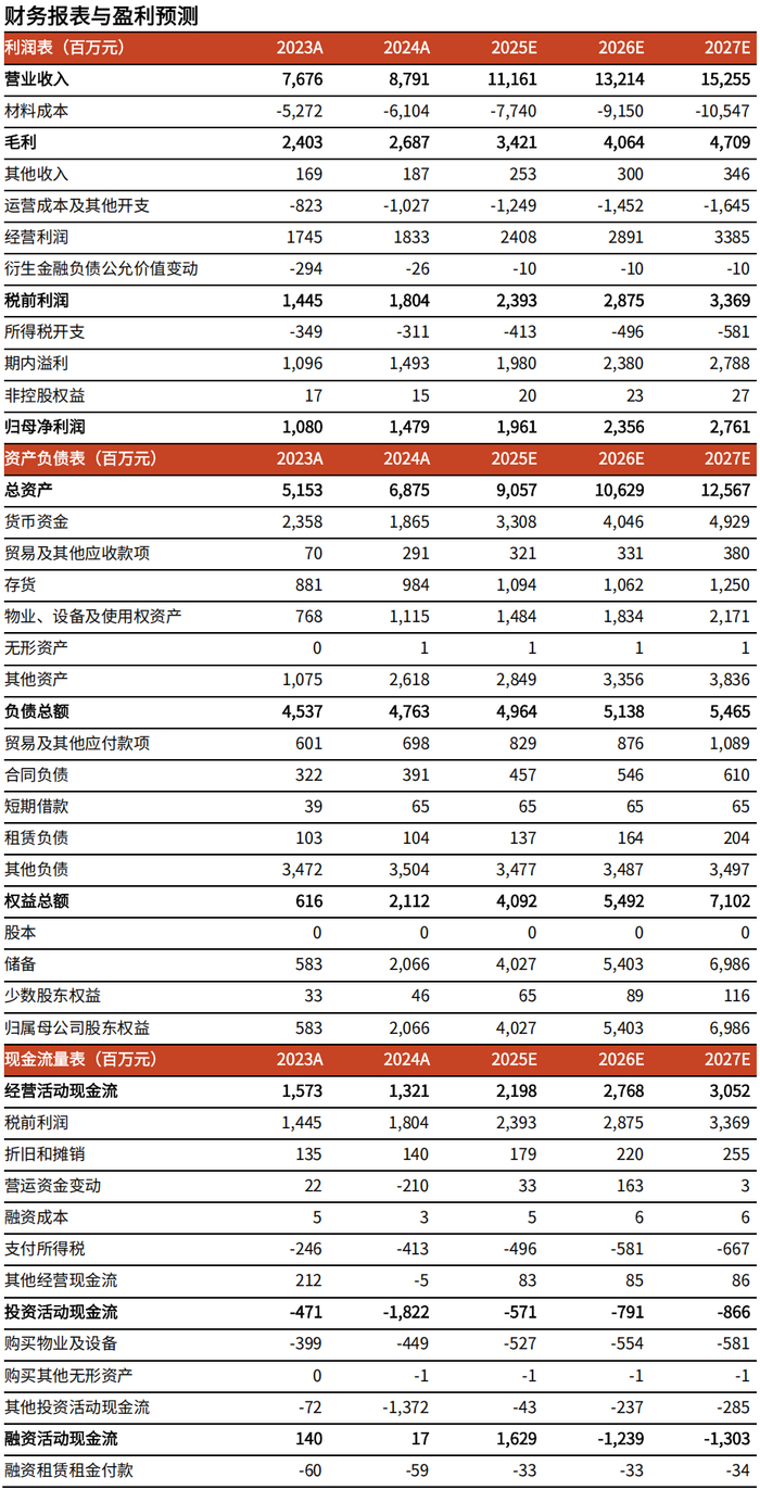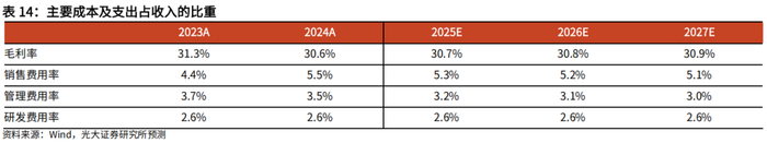 成本及支出方面:1)毛利率:2024年毛利率为30.6%,随着规模扩大后产能利用率的提升,预计毛利率逐步提升,预计2025-2027年毛利率分别为30.7%/30.8%/30.9%。2)销售费用率:2024年销售费用率为5.5%,同比提升较多主要系公司加大IP联名等营销活动力度。后续随着规模效应的显现,预计销售费用率逐渐降低,预计2025-2027年分别为5.3%/5.2%/5.1%。3)管理费用率:2024年管理费用率为3.5%,随着规模效应的显现,预计2025-2027年分别为3.2%/3.1%/3.0%。4)研发费用率:2024年研发费用率为2.6%,近两年基本保持稳定。公司长期保持较高频率的产品上新,预计研发投入将继续保持稳定,维持在2.6%。